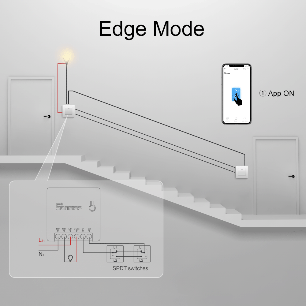 You can deploy a smart home solution with MINI like getting the connected light or device controlled from two different locations (two-way control), mobile app or just a simple voice command. Under the two-way control of external switch connection, the new edge mode is quite friendly for users who don’t require a specific direction to “Open” and “Close” state on the switch button so that each press of the external switch triggers the state of the light, no more need to judge your next operation triggers the light turn on or off via the direction of the switch button. The edge mode is available for V3.5.0 firmware of MINI and V4.2.0 eWeLink app.
