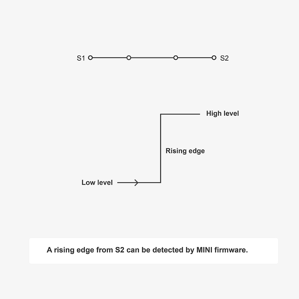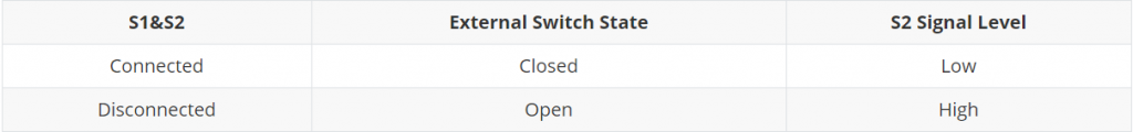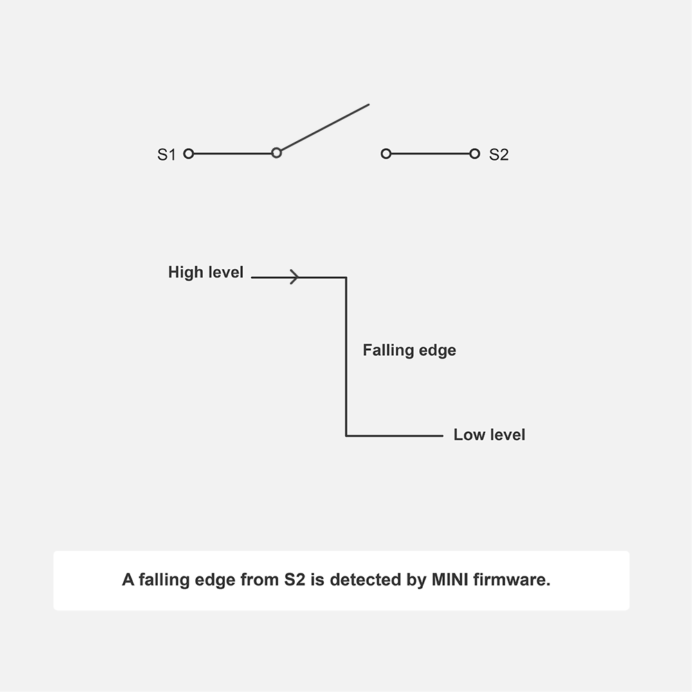 In the MINI circuit, the S1 is at signal ground level while the S2 is hanging with a pull-up resistor at 3.3V level. The change of the external switch state triggers the S2 signal level change. when S1 and S2 are disconnected (external switch state is open), the S2 signal level is still kept as 3.3V high level signal, the connection of S1 and S2 would lead S2 signal level into “ground” low. Here is a table to indicate the relationship of external switch state vs signal level.